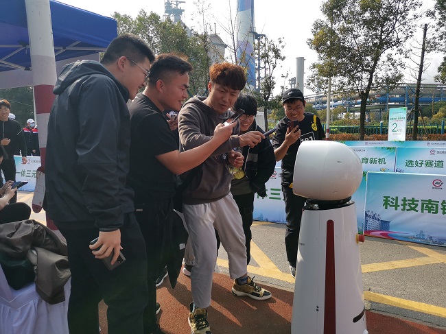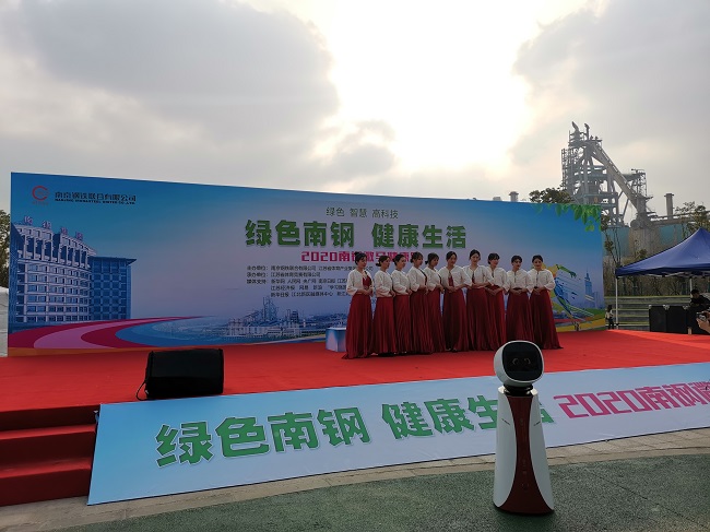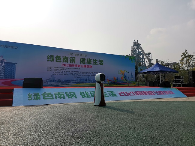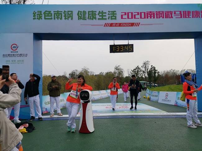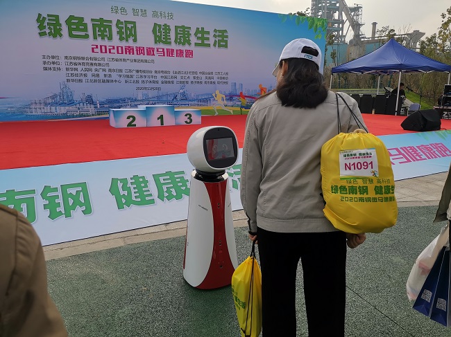 本次微马健康跑以“绿色南钢、健康生活”为主题,绿色、智慧、高科技也成为本次活动的关键词。为彰显智慧微马形象,活跃现场氛围,提高现场观众的参与热情,南钢首届微马特意邀请了南大电子机器人“小南”团队全程服务。在活动现场,“小南”团队教科书式的站在起点处,全程为大家做好接待及引导服务,并通过语音交互及UI展示为现场人员介绍南钢公司的发展历史,宣读微马健康跑的主旨精神,为参赛者解答健康跑的赛事安排。